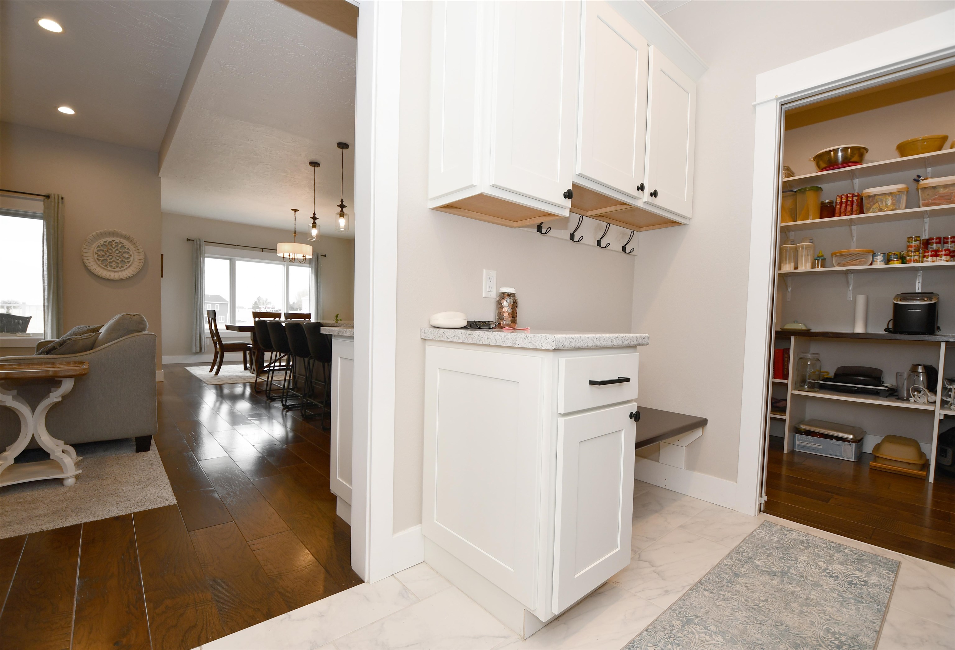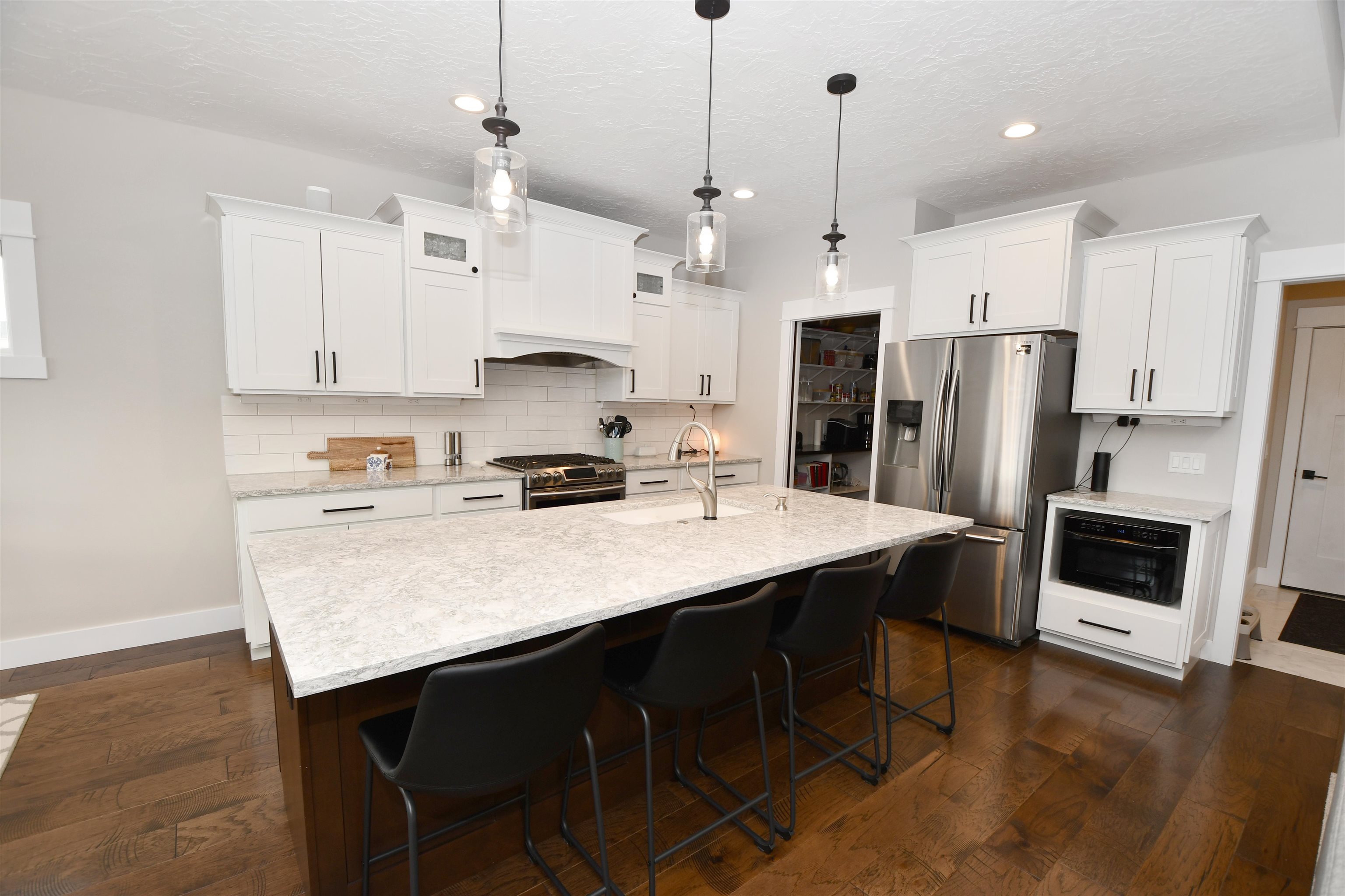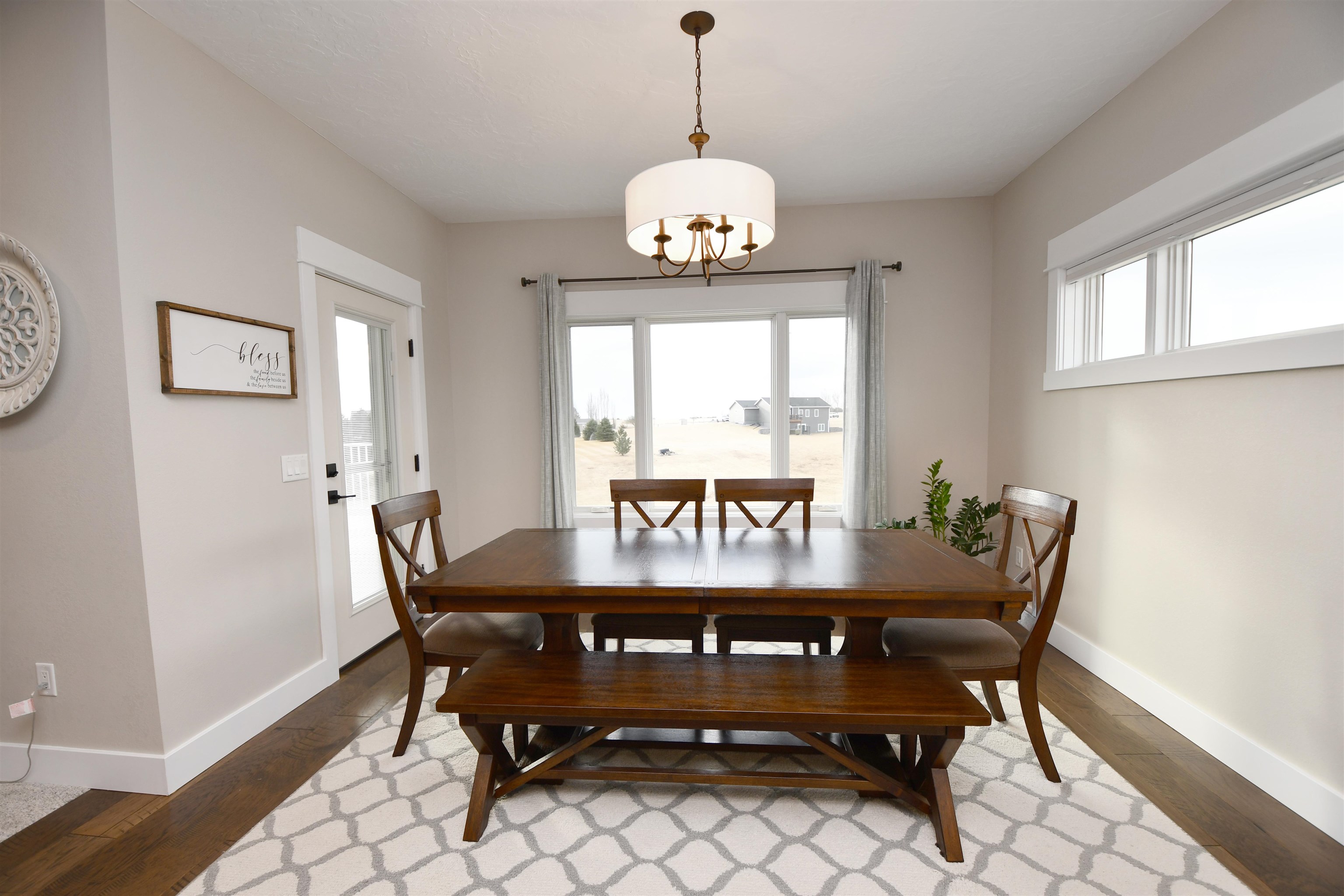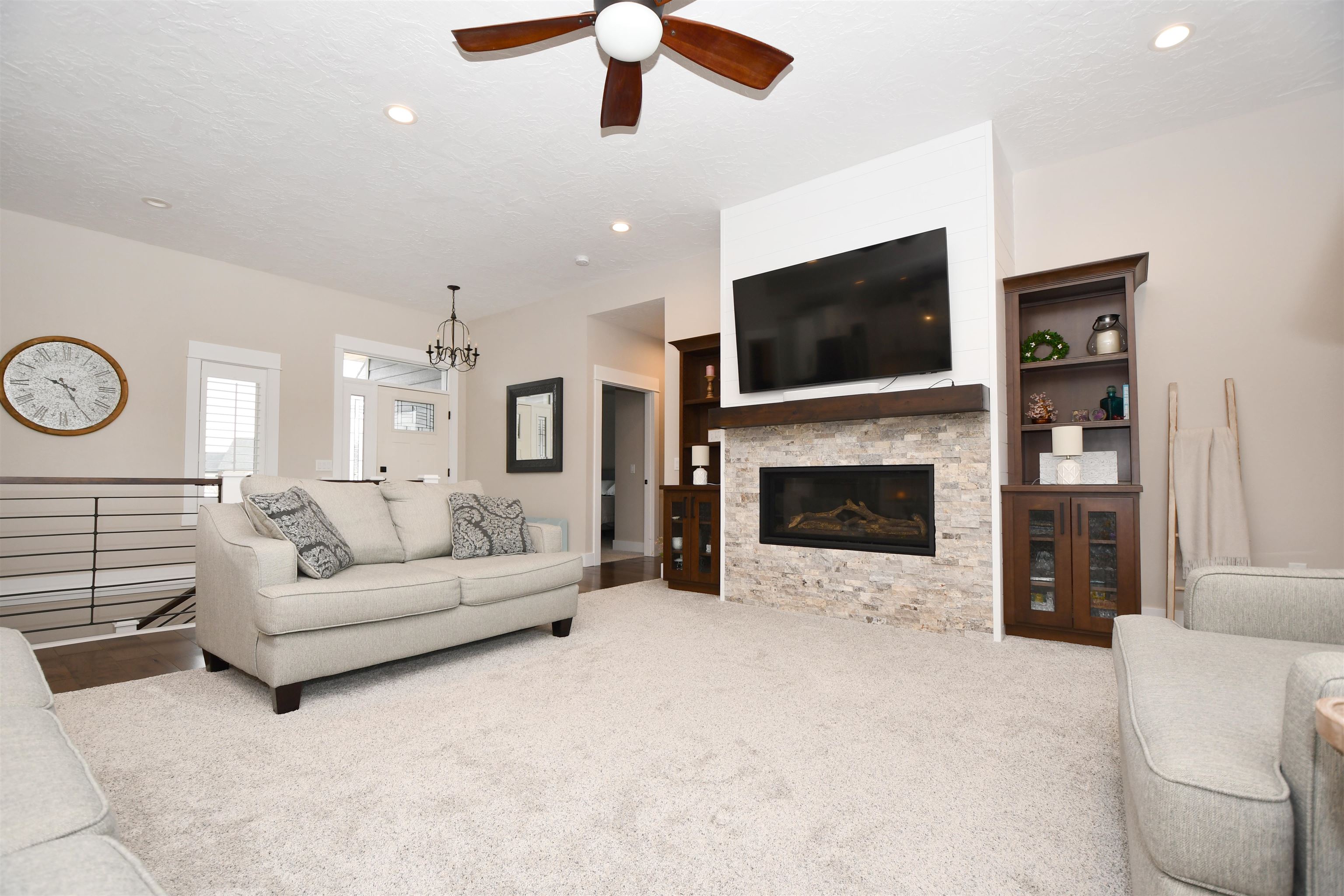 Welcome to this stunning custom-built home, thoughtfully designed in 2018 with quality craftsmanship and comfort in mind. Situated on a small acreage just northwest of Kearney in a quiet neighborhood. This spacious five-bedroom, three-bathroom residence features beautiful wood floors, a cozy fireplace, and a fully finished basement - perfect for both everyday living and entertaining. The convenience of main-floor laundry adds to the home's functional design. The kitchen is true standout, showcasing elegant quartz countertops and a large walk-in pantry for ample storage and convenience, while the bathrooms feature luxurious onyx finishes. High-end materials and finishes throughout, sourced from CMH Interiors, Century Lumber, and Builders Warehouse, add to the home's exceptional quality. Built with added insulation throughout for enhanced comfort and energy efficiency, this home also includes an amazing geothermal heating and cooling system - a huge money saver. Step outside to a beautiful deck with great views, ideal for relaxing or hosting guests, and enjoy the convenience of underground sprinklers. A custom-built shop and garden shed completes this exceptional property - offering the perfect blend of comfort, functionality and modern living.