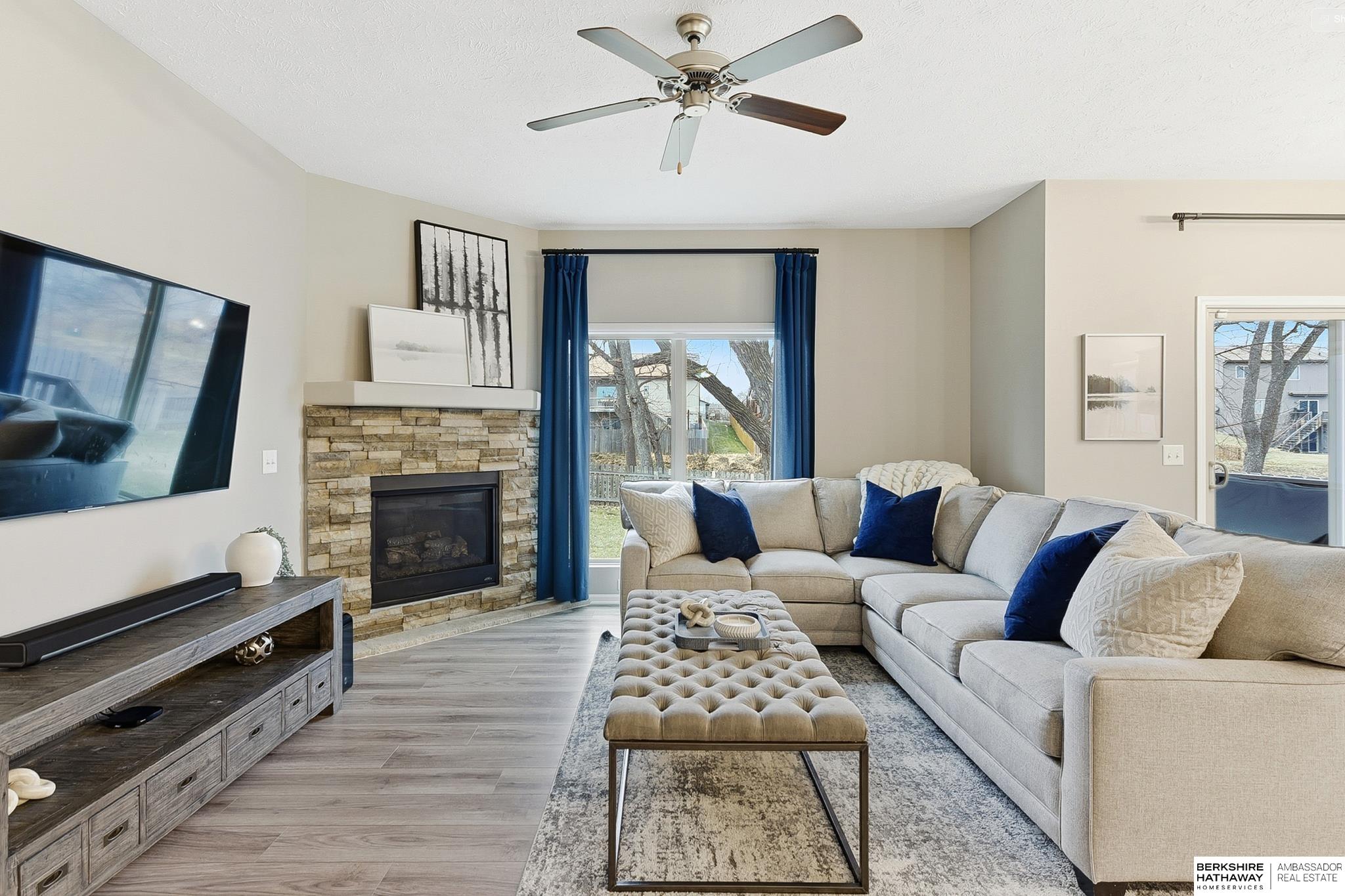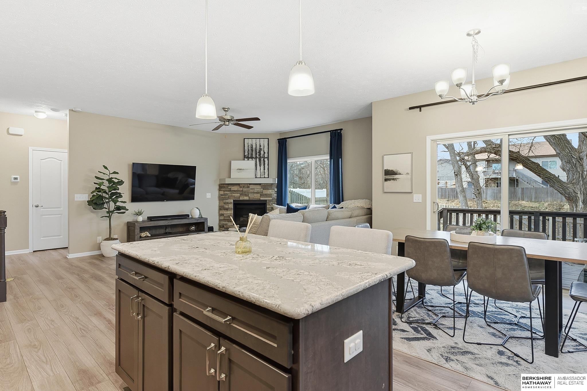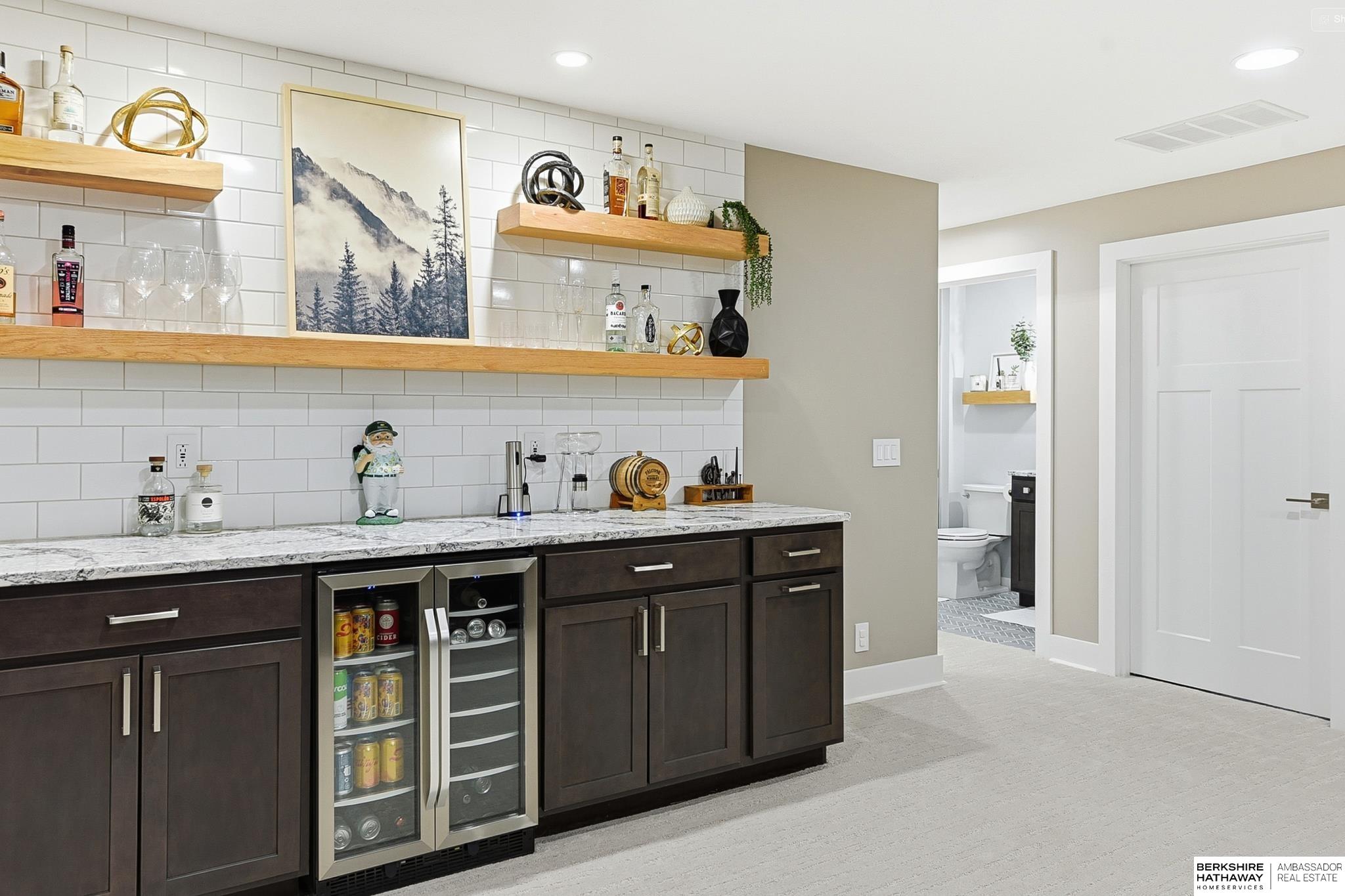 Remarkable Ranch Backing to Trees in Popular Wood Valley! Great curb appeal w/stone accents, new roof & gutters (2024), shutters & professionally landscaped. Open & stylish interior finishes w/LVP flrs (living rm, kitchen, laundry, & hallway), white woodwork, stone fireplace & custom blinds. Modern kitchen has shaker-style cabinets, quartz counters, subway tile, island, SS appliances & dinette that opens to partially covered deck (10x12). Primary suite has walk-in closet & bath w/double quartz vanity & heated, stone flr. Beds 2 & 3 (custom closet in bed 3) are near front of home w/easy access to full bath. Main flr laundry/drop area just off garage. Newly finished basement features spacious family rm, dry bar, 4th bed & contemporary bath w/heated tile flr. Dry bar has quartz counters, subway tile, wood shelving & SS appliances. XL storage space w/room for gym. Private, fully fenced bkyd (stained wood), sprinklers & deck awning. Close to Standing Bear & neighborhood parks. Impressive!