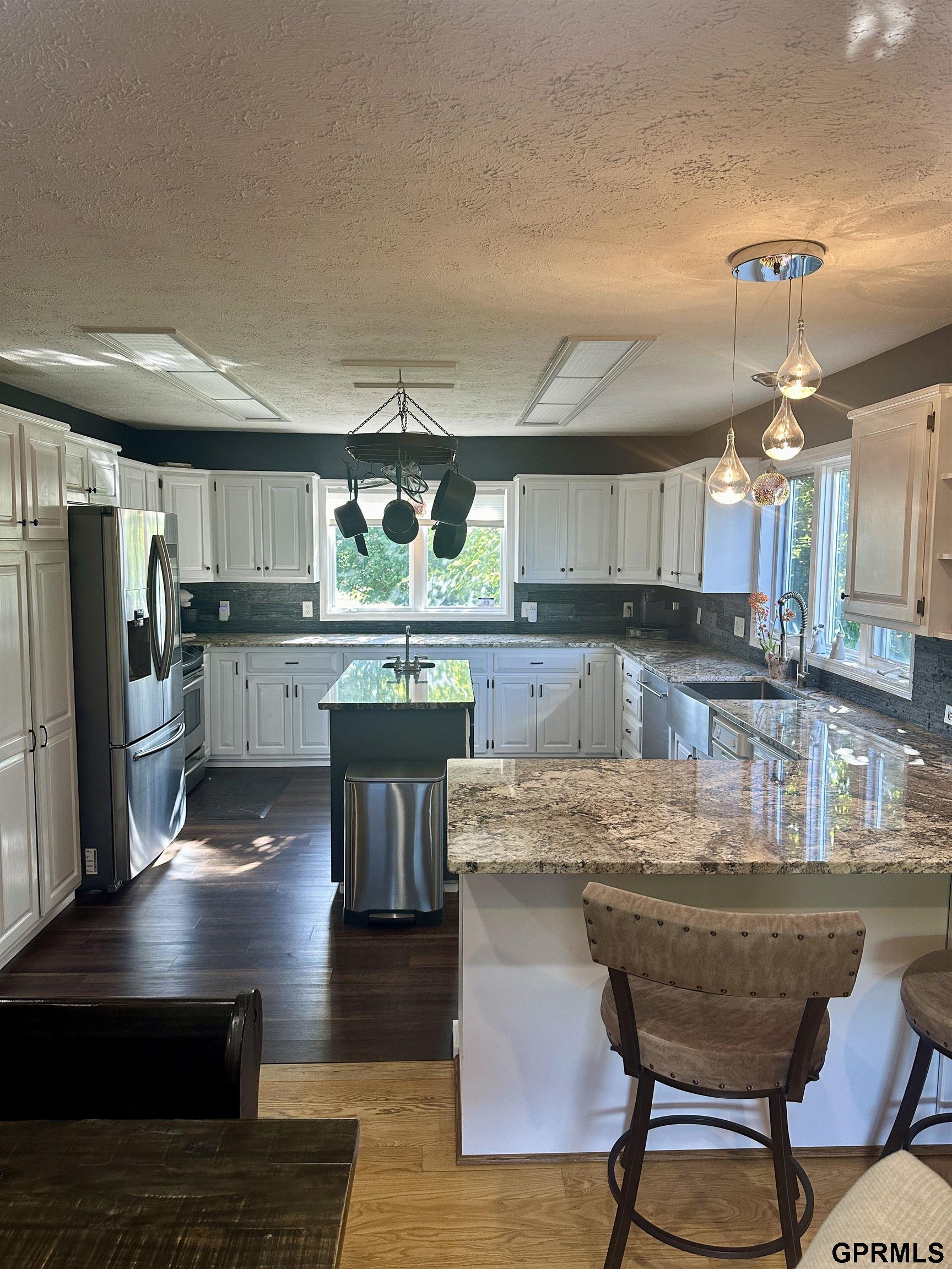 Large Updated Home on 10 Acres Just Outside Arlington on County Road 5 Spacious 5-bedroom, 4-bath home combining comfort and style. The main floor includes a half bath and a primary suite with a ¾ bath, walk-in closet, and stunning black granite floors, walls, and vanity. Upstairs features a ¾ bath with spa tub and granite tile, while the walk-out basement offers a full bath with tub and shower. The upscale kitchen has stainless steel appliances, a center island with sink and disposal, and abundant cabinet space. The open dining and living area includes both propane gas and wood-burning fireplaces, capable of heating the entire home. Enjoy three decks-two screened in-with views of Fremont and amazing sunsets The top level features a large family room or second primary suite with patio doors leading to an exterior staircase. A 5-car garage and 20x40 in-ground saltwater pool complete this exceptional property.