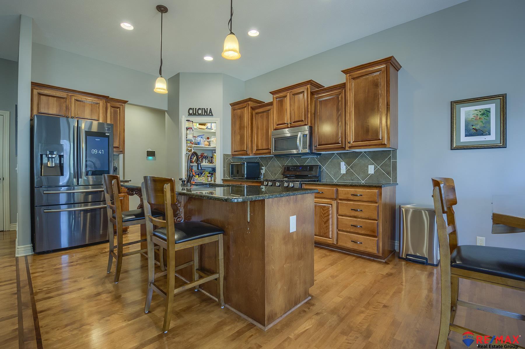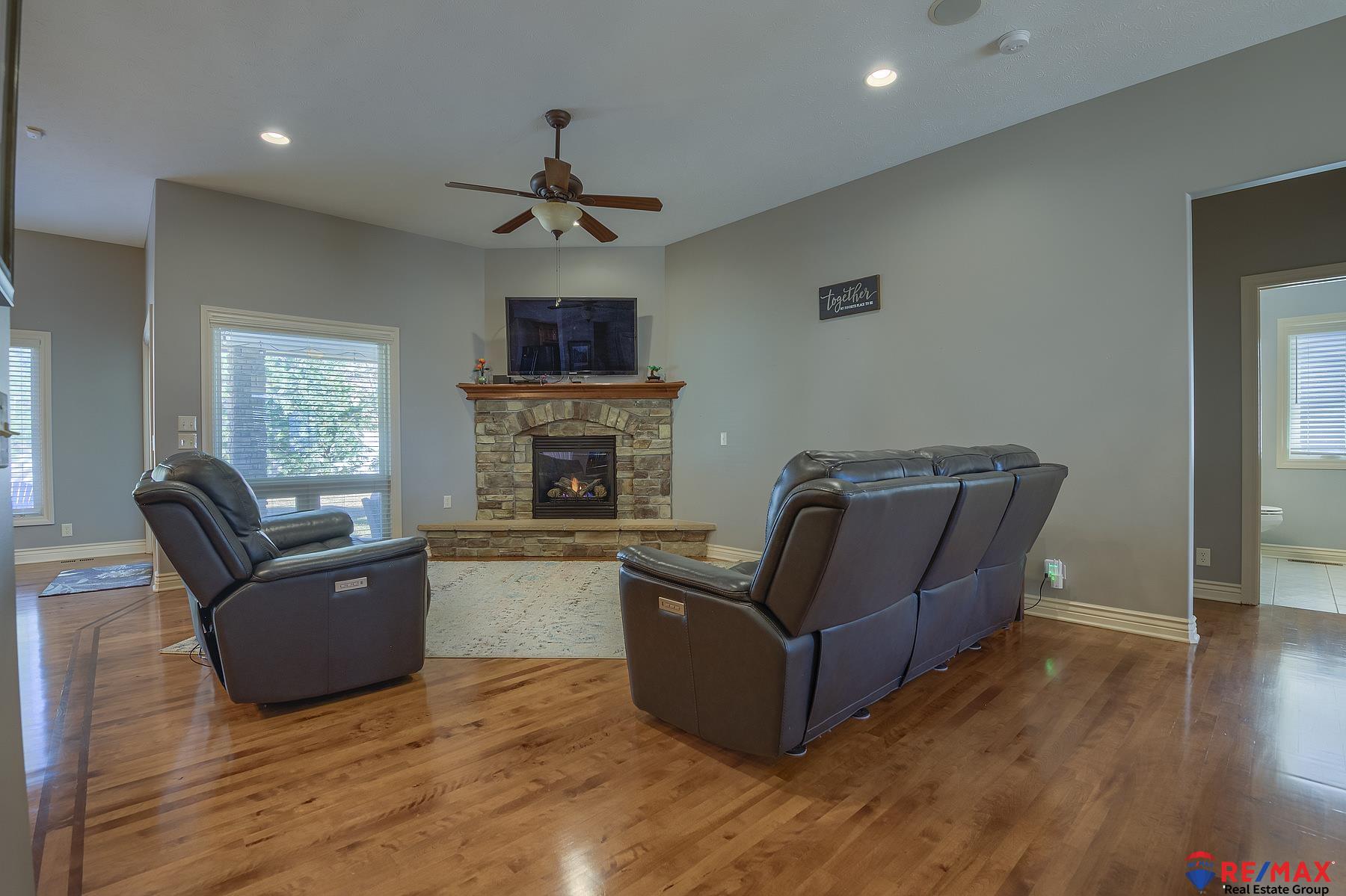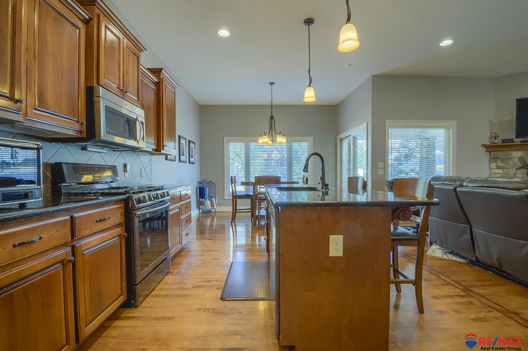 Open Sunday Feb. 22 from 1-3. Stop by! Like new 5BR, 3BA, 3 car south-facing ranch offering style, space and many upgrades throughout. Split bedroom design on main floor. Stunning wood floors in the LR, kitchen, drop zone and hallways. Kitchen flows into the living and dining areas. Primary suite walk-in shower, dual sinks, and a private patio door access to the ultimate backyard oasis. Main floor laundry room has sink & lots of cabinets. Professionally landscaped yard complete with a privacy fence, 24x14 covered patio and fire pit. Finished lower level was built for entertaining with a wet bar/kitchenette, media area and game area plus two additional bedrooms and bath. Loaded with upgrades including Andersen windows, newer roof, gutters, Leaf Filter system, water heater, disposals, dishwasher and security system. This move-in ready ranch truly has it all--space, updates and an unbeatable backyard setting! Assumable 3% VA loan for qualified buyer.