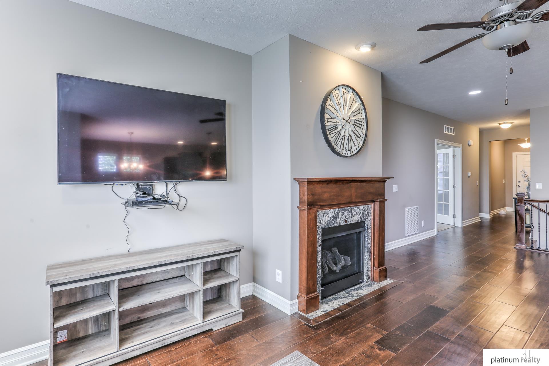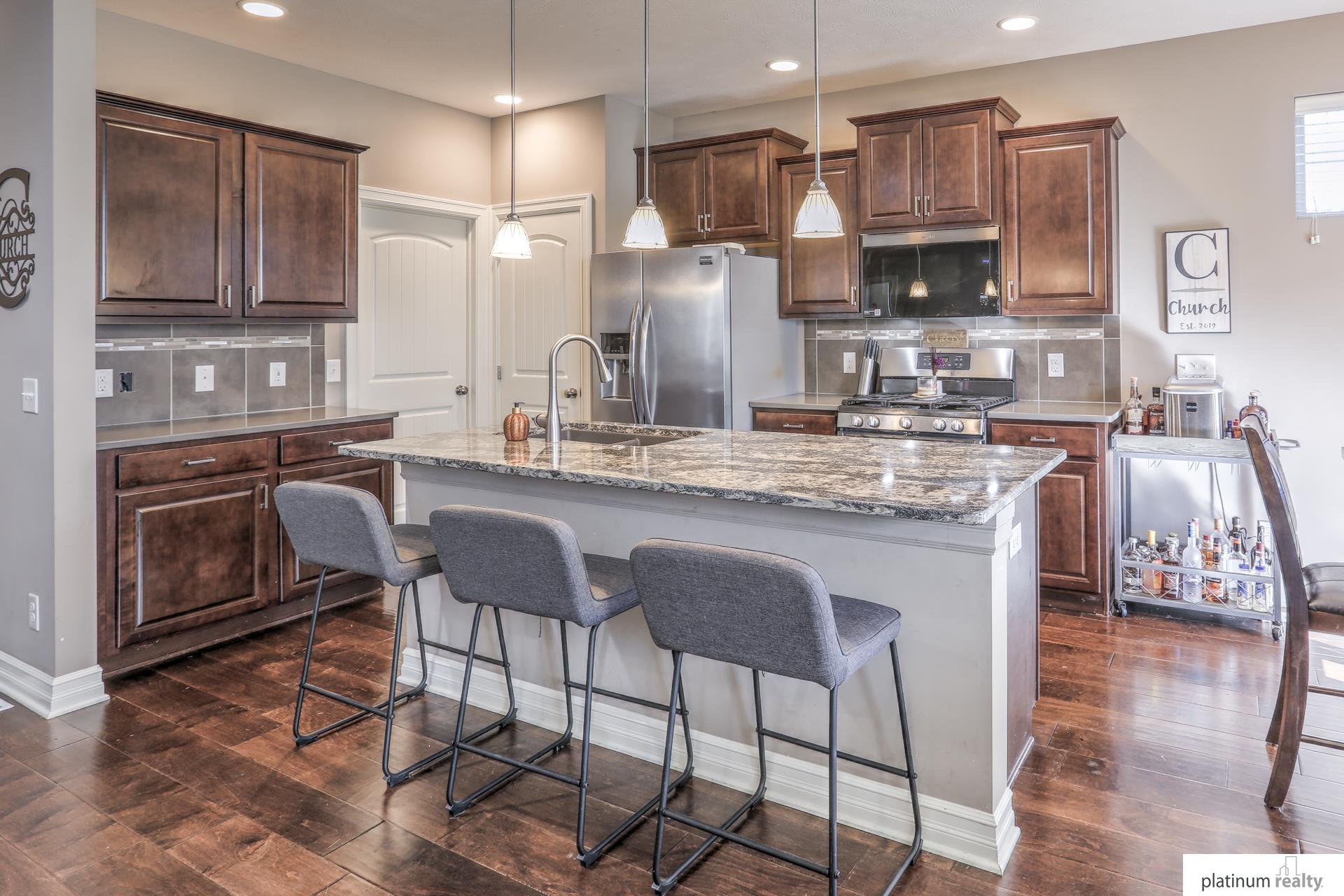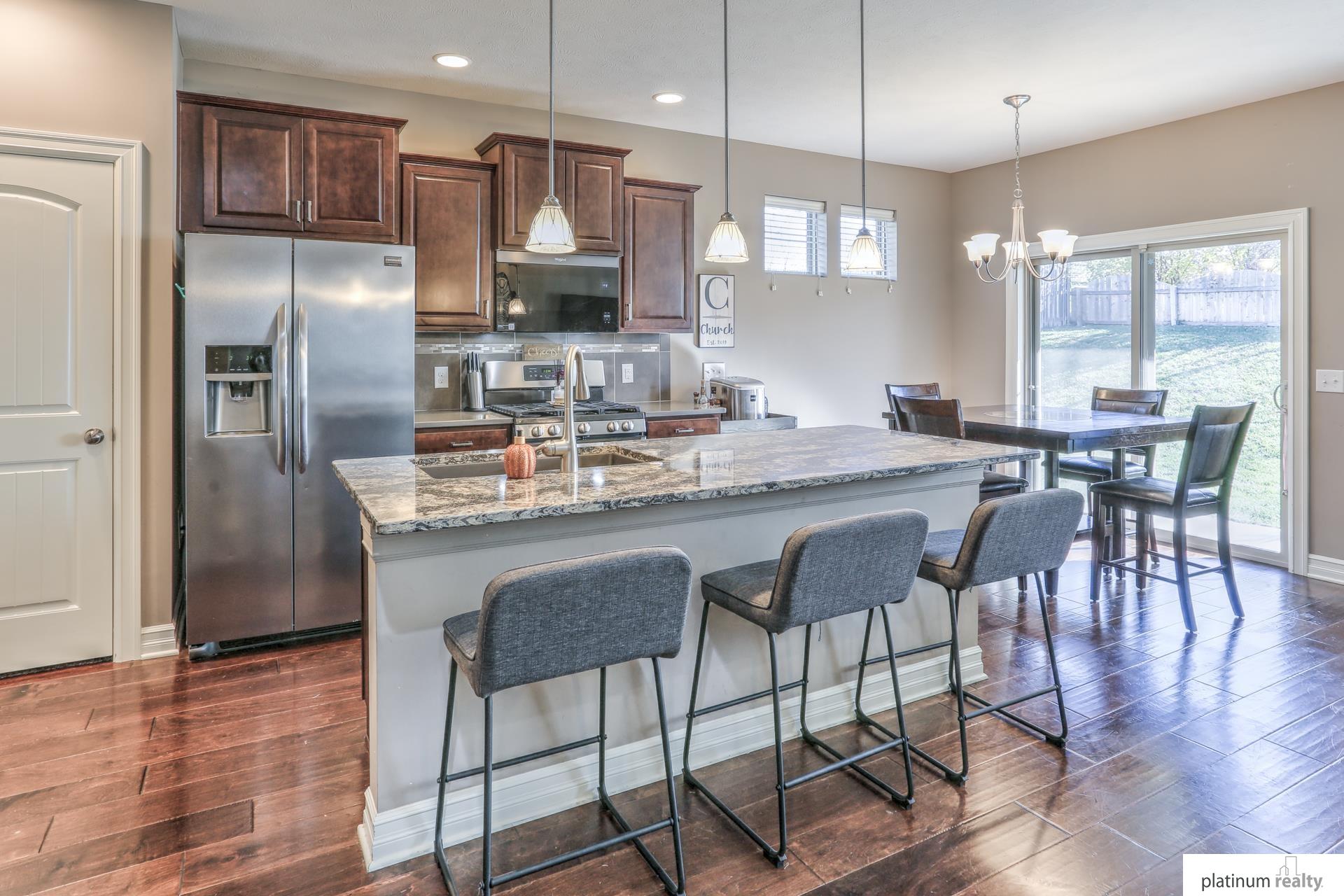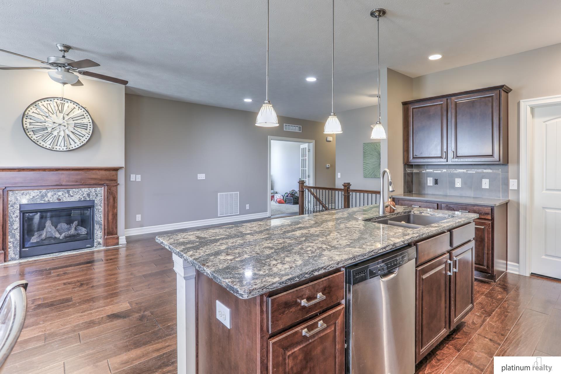 Beautiful Ranch Home with Open Floor Plan and Modern Finishes. Immaculate ranch home featuring an open-concept layout with hardwood floors throughout the main living areas. The spacious kitchen offers granite countertops, stainless steel appliances, a large island, and rich wood cabinetry. The bright living room includes a cozy gas fireplace and large windows that provide plenty of natural light. The primary suite features a comfortable layout with ample closet space and a private bath. Additional bedrooms offer flexibility for guests, an office, or hobbies. Enjoy dining with a view of the backyard and easy access to the patio—perfect for entertaining. Beautiful curb appeal with mature landscaping and a covered front porch. Conveniently located near parks, schools, and lakes. Move-in ready and meticulously maintained!