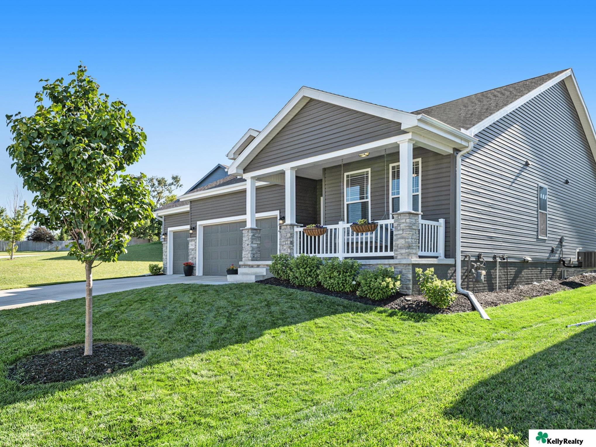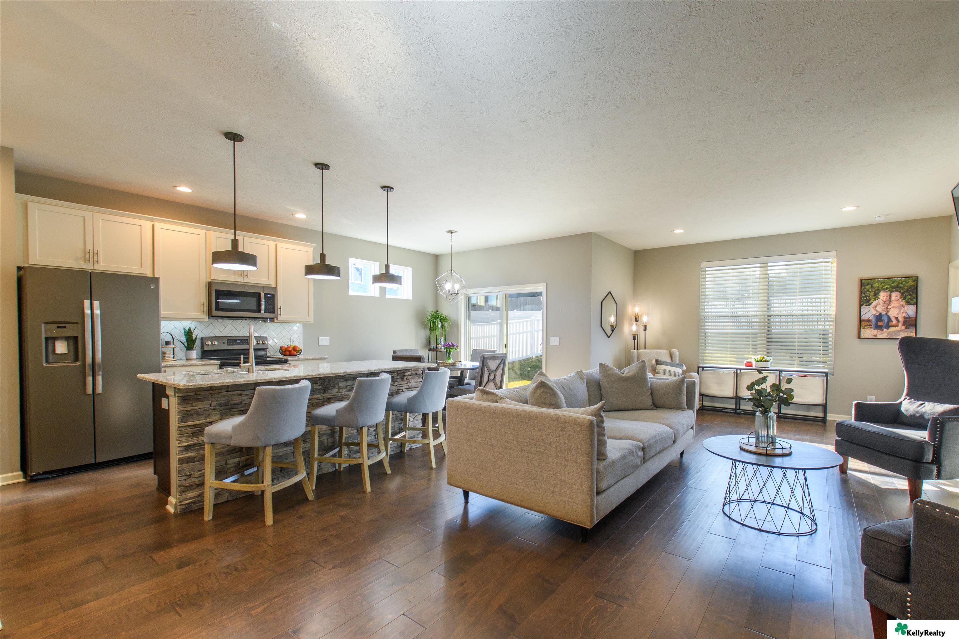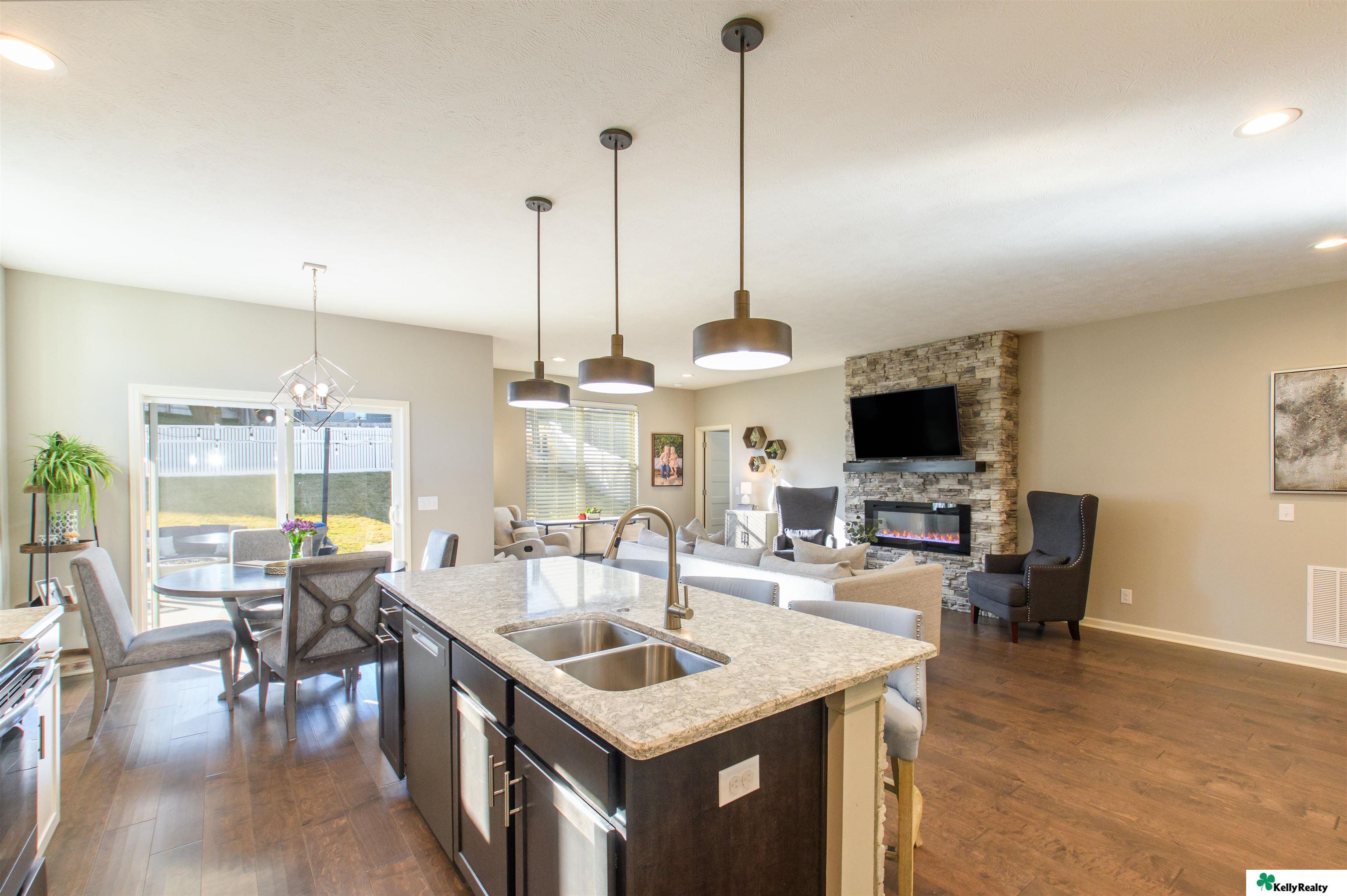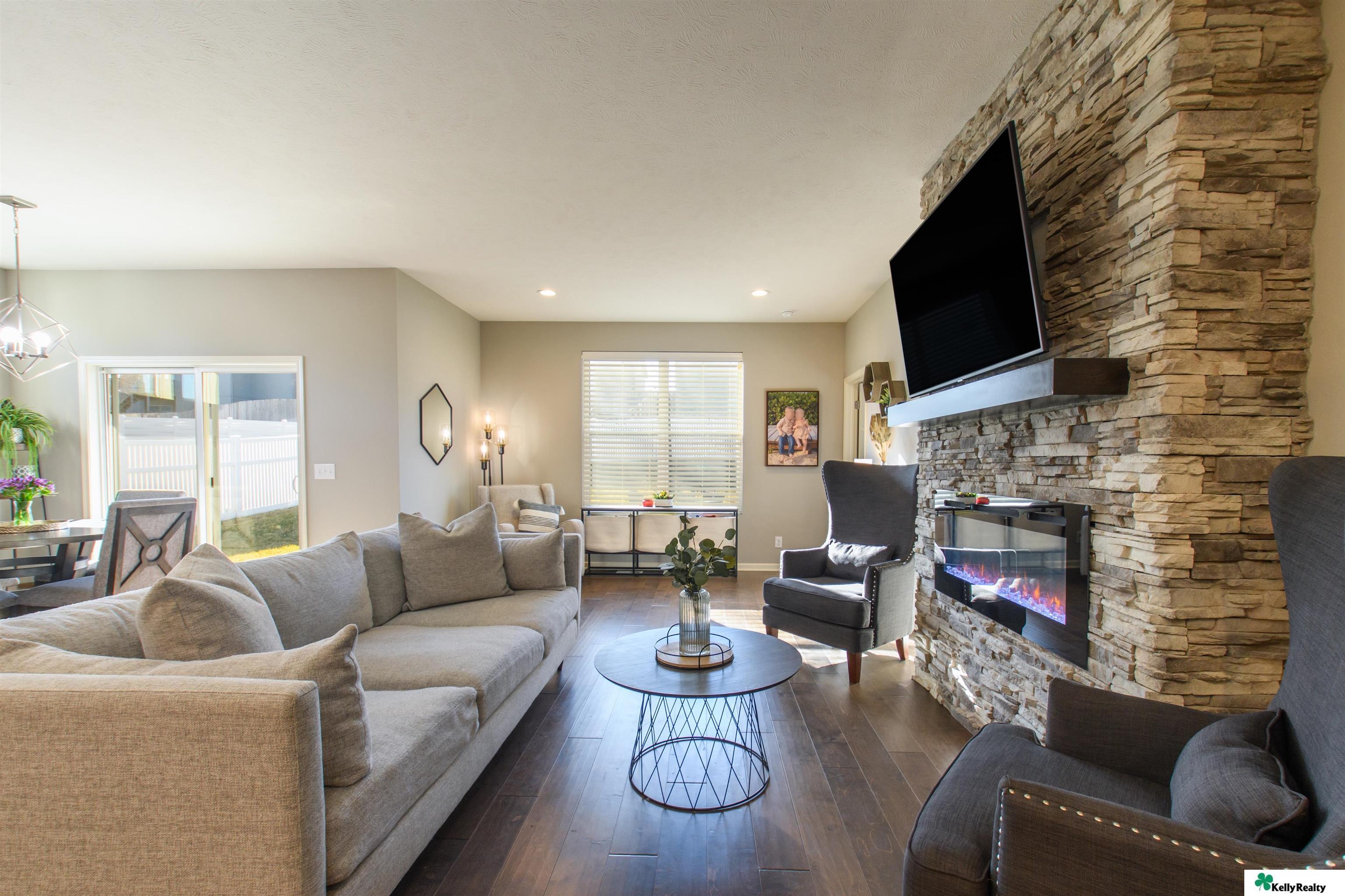 Welcome to 7912 S. 185th St. in Omaha! This beautifully maintained 4 bed, 3 bath, 3-car garage home built in 2019 showcases quality craftsmanship and designer finishes throughout. The main floor features engineered hardwood flooring flowing through the hallway, living room, kitchen, and dining area. The living room is highlighted by a stunning stone-wrapped fireplace. The kitchen offers slate appliances, quartz countertops, and modern finishes that continue throughout the bathrooms. The primary suite includes a walk-in closet and spa-like bath with dual vanity, shower, and toilet area. The finished lower level provides a spacious living area, fourth bedroom, three-quarter bath, multipurpose room with ample storage, and water softener. Enjoy the fully fenced backyard with an extra-large concrete patio and sprinkler system - perfect for entertaining or relaxing. Showings begin Friday March 13!