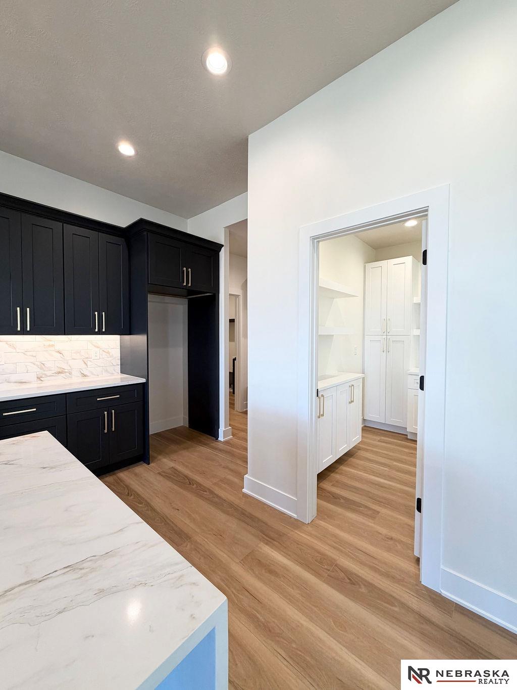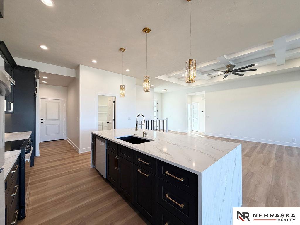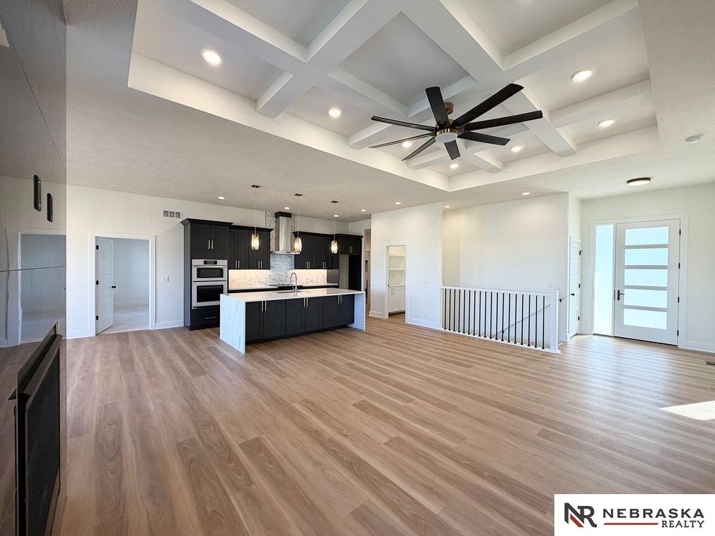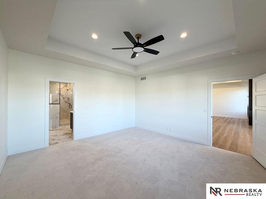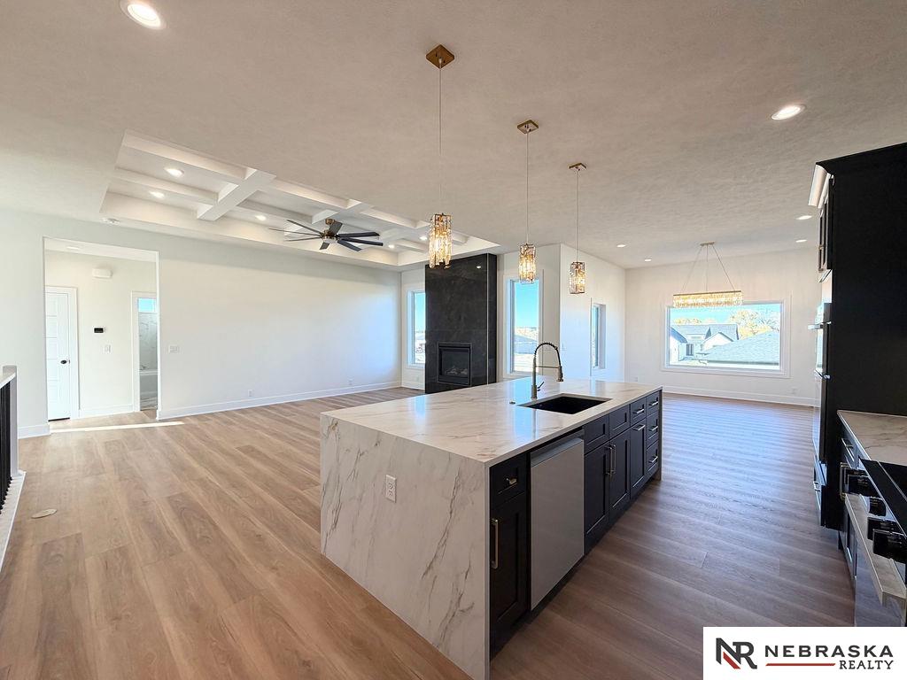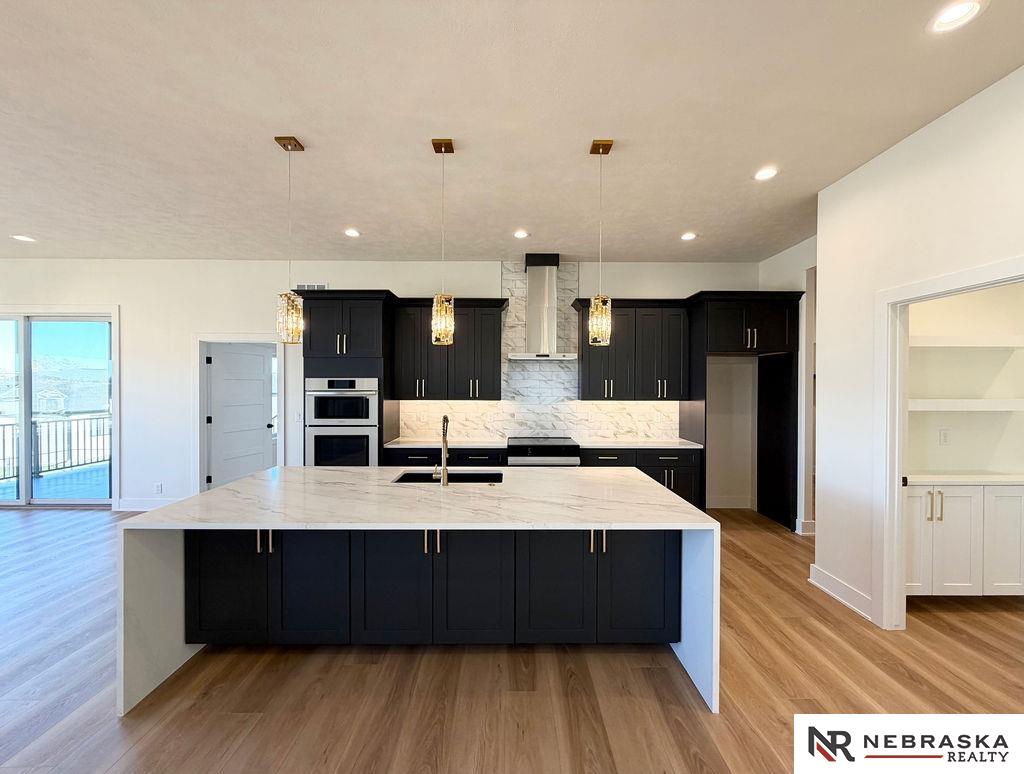 Welcome to this stunning 3,663 sq. ft. custom home with nearly 2,000 sq. ft. on the main level! This open-concept plan offers 3 spacious main-floor bedrooms, including a luxurious primary suite with an expanded walk-in closet and a spa-inspired bath featuring an oversized walk-in shower, freestanding soaking tub, dual vanities, and heated tile flooring. The upgraded kitchen boasts a huge center island with quartz countertops, a waterfall edge, and custom cabinets with tons of storage. The walk-in pantry contains lots of extra cabinetry and countertops to double your workspace. Enjoy an enlarged dining area leading to a deck through an oversized sliding glass door flooding the space with natural light. The great room features extra-large windows flanking the fireplace. Downstairs includes a large galley-style wet bar, office, and generous storage. Enjoy endless amounts of hot water with your tankless gas water heater. Every detail is designed for comfort, function, and style!