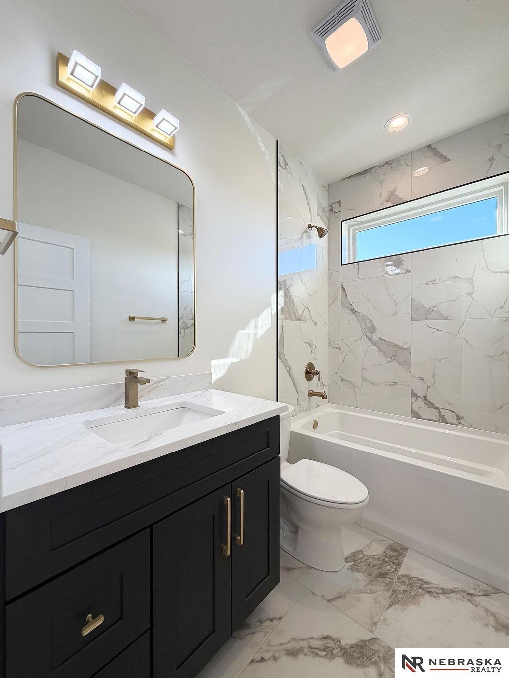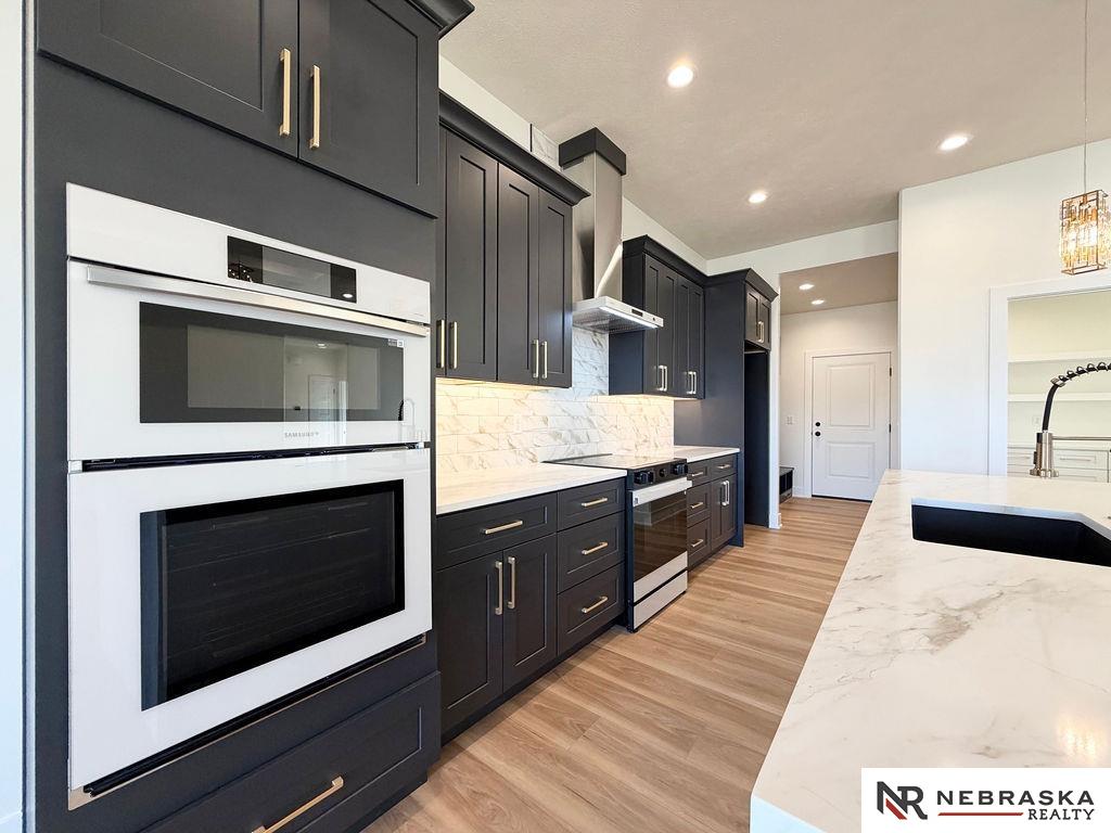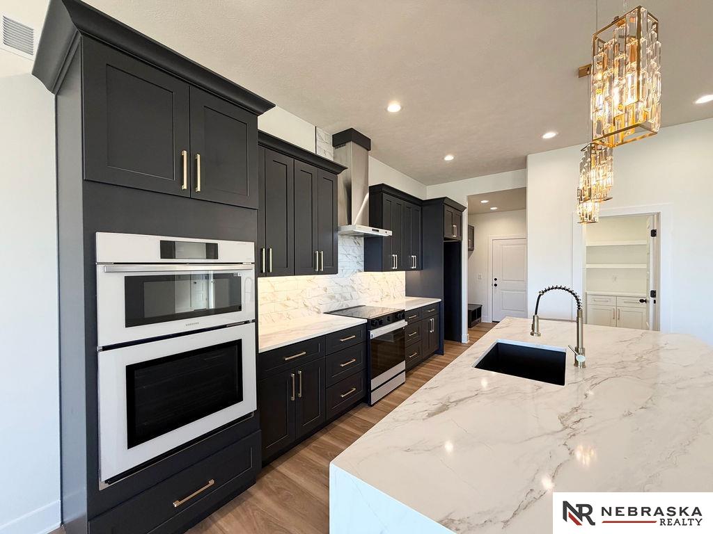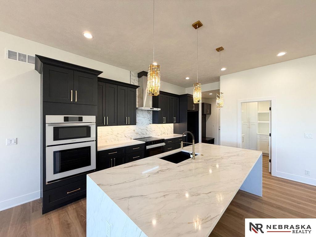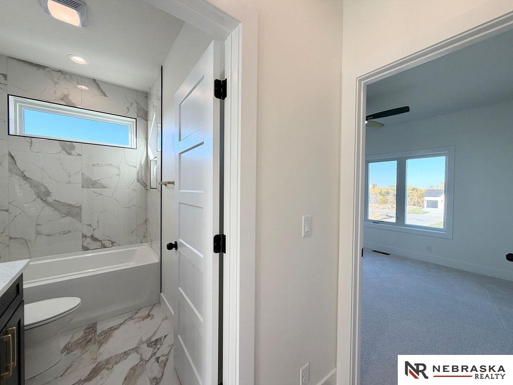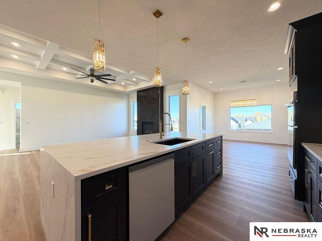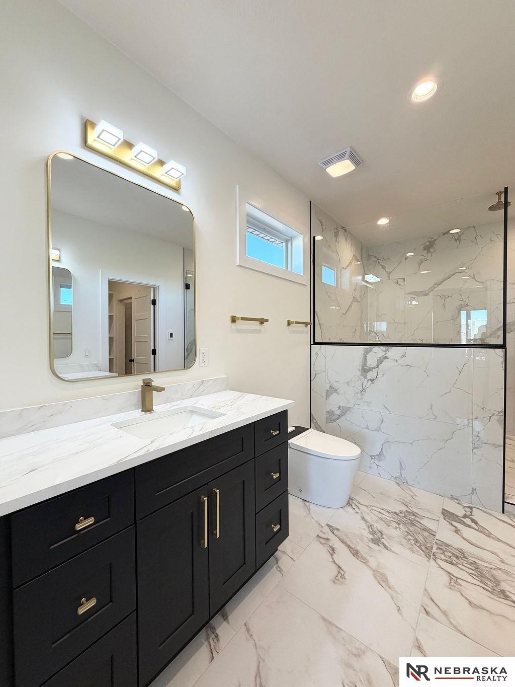 Welcome to this stunning 3,663 sq. ft. custom home with nearly 2,000 sq. ft. on the main level! This open-concept plan offers 3 spacious main-floor bedrooms, including a luxurious primary suite with an expanded walk-in closet and a spa-inspired bath featuring an oversized walk-in shower, freestanding soaking tub, dual vanities, and heated tile flooring. The upgraded kitchen boasts a huge center island with quartz countertops, a waterfall edge, and custom cabinets with tons of storage. The walk-in pantry contains lots of extra cabinetry and countertops to double your workspace. Enjoy an enlarged dining area leading to a deck through an oversized sliding glass door flooding the space with natural light. The great room features extra-large windows flanking the fireplace. Downstairs includes a large galley-style wet bar, office, and generous storage. Enjoy endless amounts of hot water with your tankless gas water heater. Every detail is designed for comfort, function, and style!