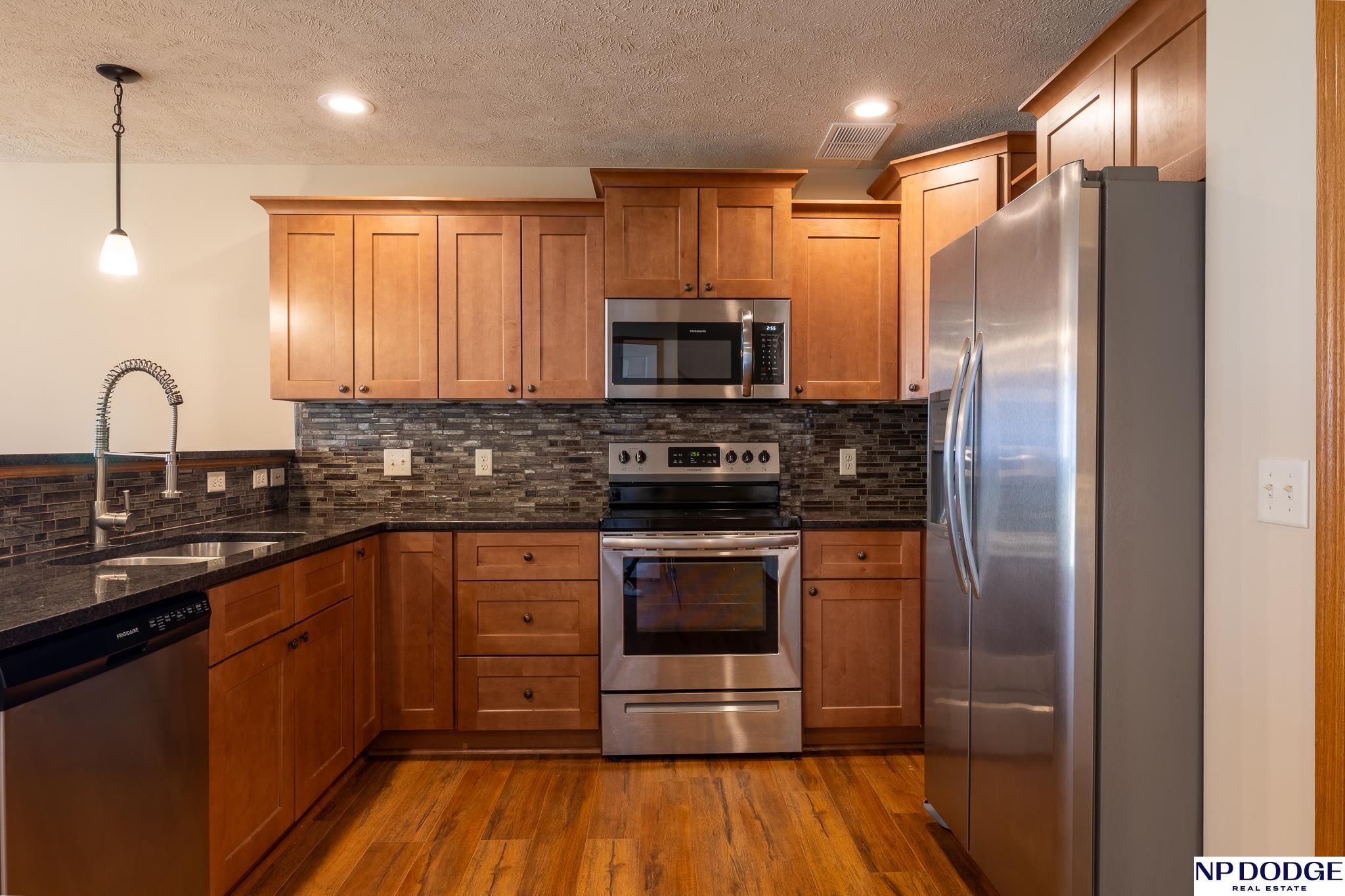 This 3 bedroom, 2 story townhome with 2 stall garage is spotless and ready for new owners. The owners have made many improvements including vinyl plank flooring on 1st floor, kitchen backsplash, a solid gazebo covering the extended back patio, landscaping with trees, berms, and rock, and all new interior paint. The first floor features openness with little wasted space. The kitchen has granite countertops, stainless appliances and soft close cabinetry and the laundry is adjacent. Upstairs, the primary bedroom is huge with great walk-in closet and 3/4 bath. Another full bath services the two additional, spacious bedrooms, and there is a powder room on 1st floor. The lot is bigger than most townhome lots and can be fenced if new buyers choose. The location has easy access to the interstate as well as shopping and other services. HOA dues take care of lawn care, snow removal, and garbage service.