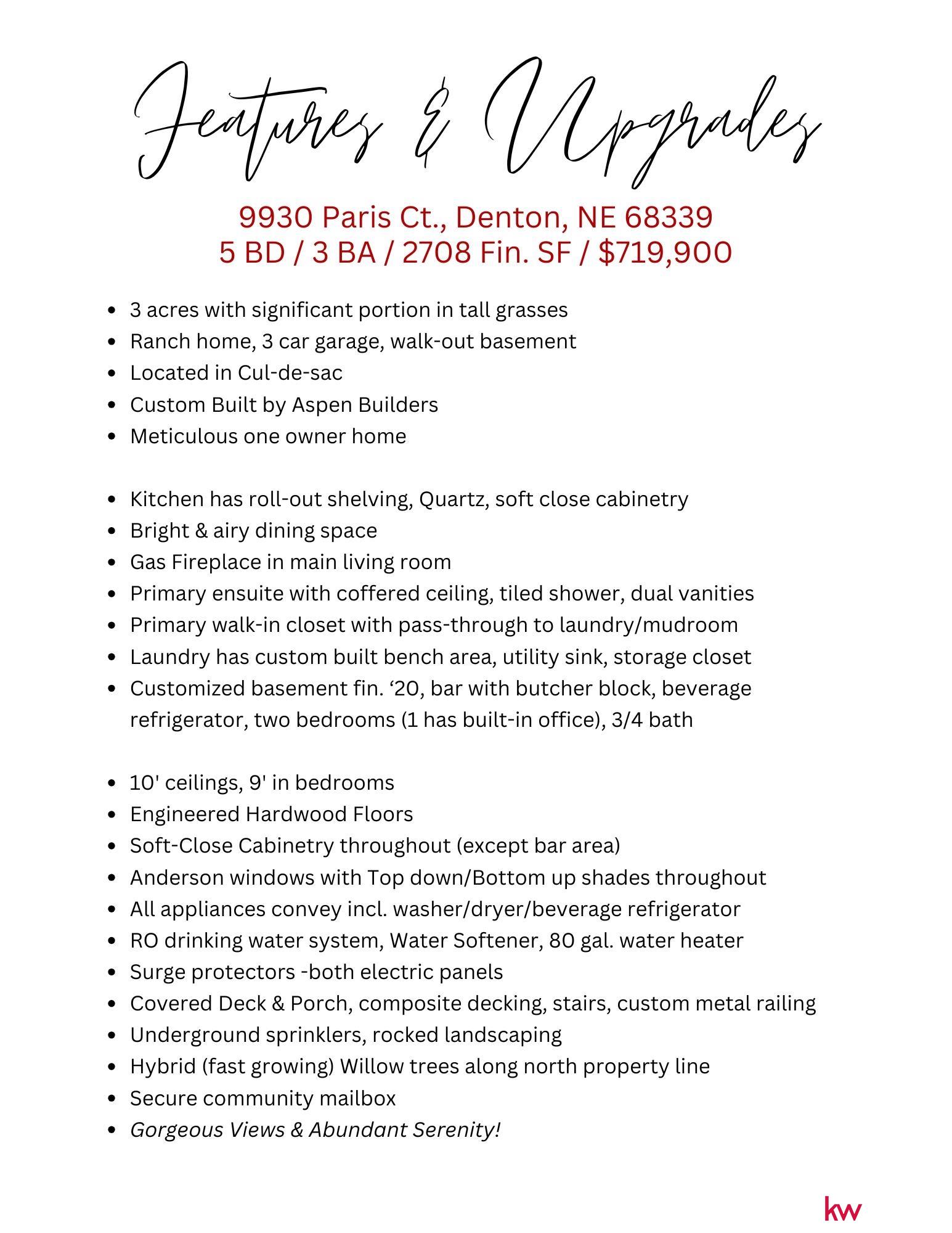 Welcome to 9930 Paris Ct, where comfort, space, and lifestyle come together in one of Lincoln’s most desirable settings. Tucked away on a quiet cul-de-sac, this 5-bedroom, 3-bath home sits on 3 beautifully landscaped acres and offers the perfect blend of everyday living and entertaining. Inside, you’ll find bright, welcoming spaces and a thoughtful layout, including a convenient passthrough from the mudroom/laundry room into the primary bedroom closet. The finished basement provides an incredible space for movie nights, game days, or hosting guests. Outside, the acreage offers room to relax, play, and enjoy peaceful Midwest evenings while still being just minutes from Lincoln’s amenities. Imagine quiet mornings with coffee on the property and evenings entertaining friends under Nebraska sunsets. Homes offering this kind of space, privacy, and convenience don’t stay secret for long — come see why 9930 Paris Ct might be your next favorite address.