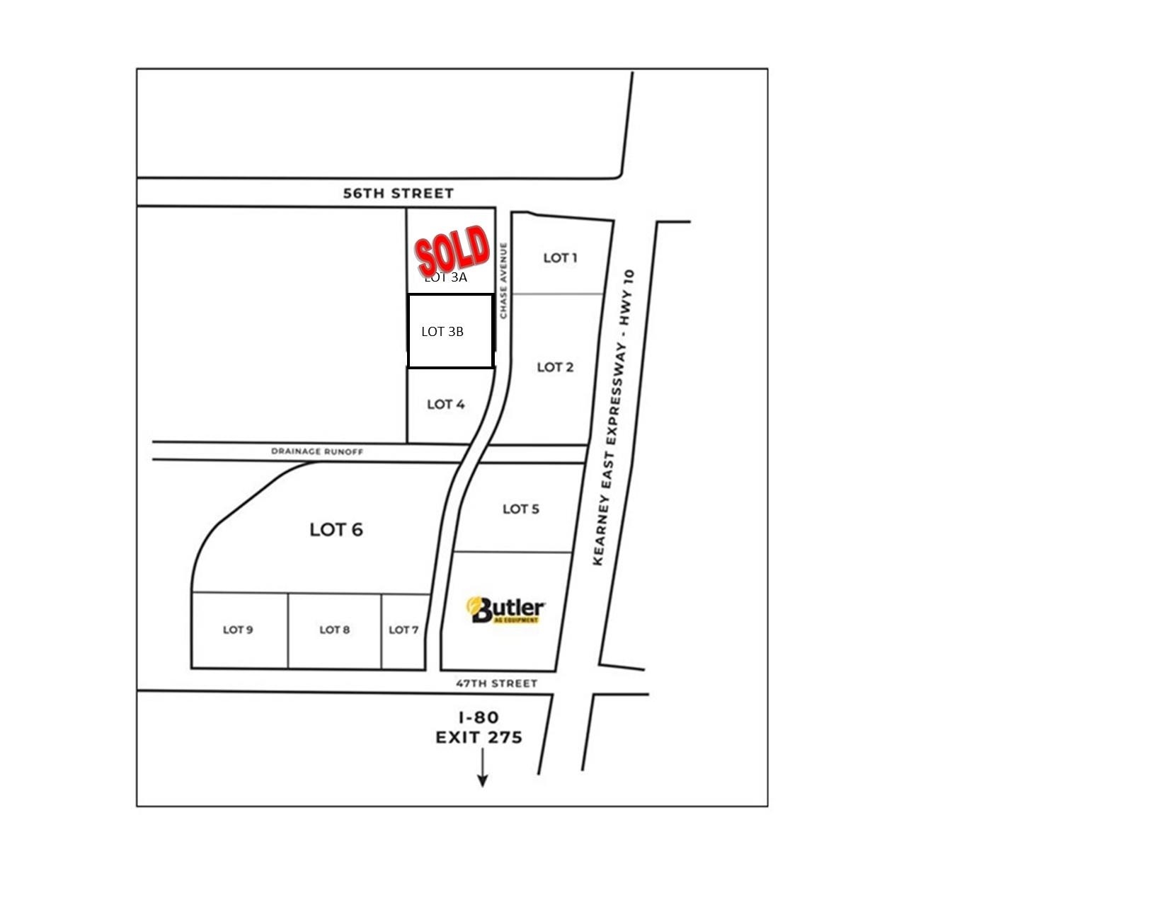 Developing area ready for your business! Join Butler Ag in their new Butler Addition on the east side of Kearney. This development is located in the southwest corner of 56th Street and Kearney Expressway-Hwy 10. This commercial development is near Kearney Regional Airport, Kearney's Patriot Park (Sports Complex), Central Nebraska Veterans Home, Farm Credit Services of America and Butler Ag Equipment. The entire development will be rezoned to Business Park(BP). Property will need to go in front of the Kearney City Council for final platting and rezoning. Excellent access to I-80. City utilities are available along Chase Avenue. Buyer is responsible for all connection cost. Flexible lot sizes.2-34 Acres, the price for this location is based on a $3.25/sq ft price. Map is for illustration purposes only. Call for more details.